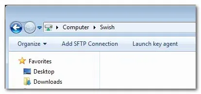 Clique duas vezes na entrada para entrar no diretório de rede Swish. Existem dois botões normalmente não encontrados no Explorer Adicionar conexão SFTP e no agente de chave Launch. De importância primária para nós, o botão de conexão SFTP; se você está se conectando a um servidor que usa autenticação de chave pública, no entanto, você também vai querer estar ciente do botão de agente de chave de lançamento como ele executa Pageant, um aplicativo de agente de chave livre incluído com Swish.