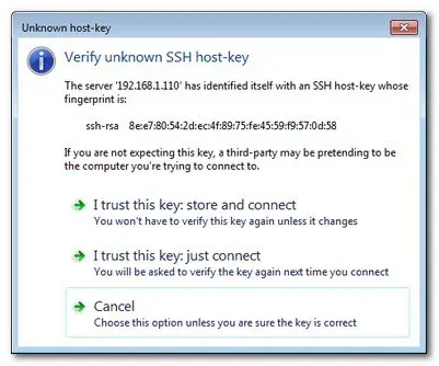 Quando você clica em uma entrada pela primeira vez, você será solicitado a aprovar a chave SSH para essa conexão: