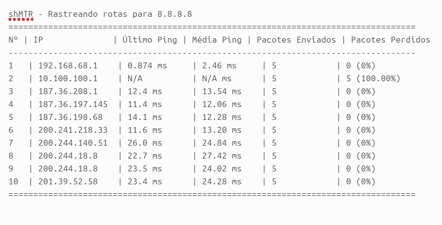 Apresento o shMTR, um utilitário de linha de comando para rastreamento de rotas e testes de ping, totalmente compatível com Shell Script. Ele é inspirado no popular WinMTR, trazendo sua funcionalidade para o mundo do Shell Script.
